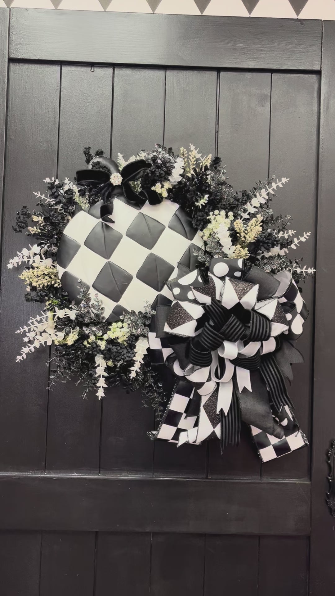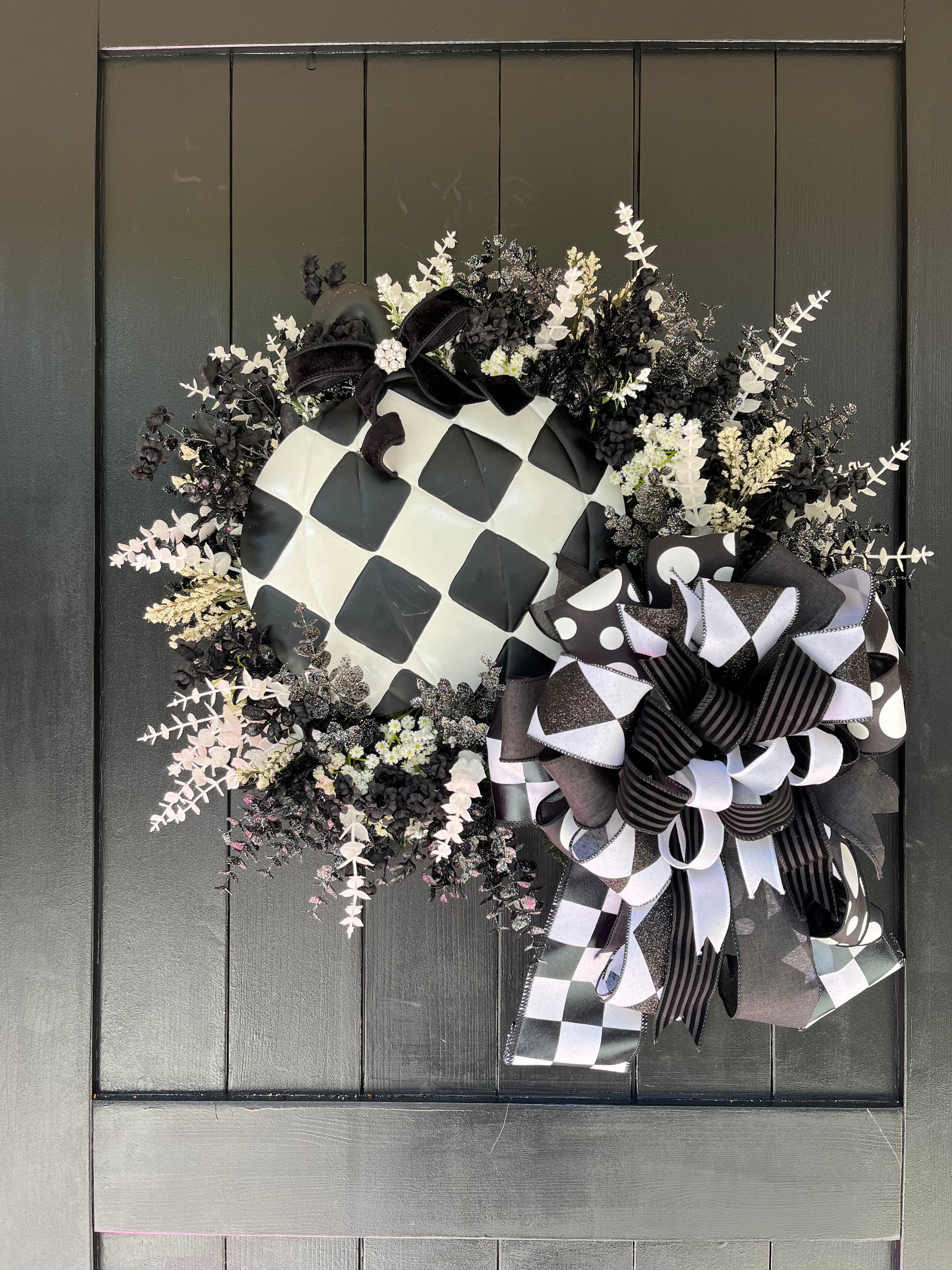 Make a bold and timeless statement this season with our Black & White Pumpkin Wreath. Featuring a striking harlequin-patterned pumpkin accented with a black velvet bow and jeweled center, this wreath blends classic elegance with modern fall charm.