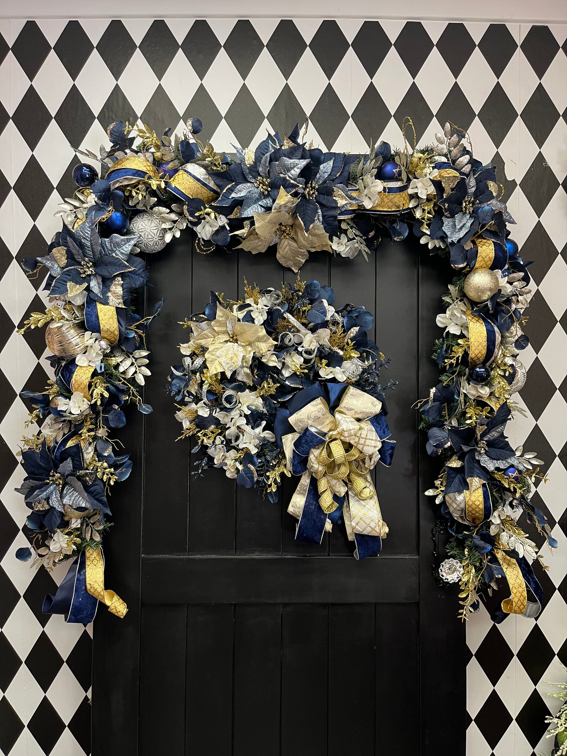 Interwoven with wide navy velvet and golden metallic ribbon, this garland drapes gracefully over doorways, mantels, or banisters. Its versatile color palette makes it the ideal pairing for matching navy-and-gold wreaths or as a standalone statement piece for the season.
