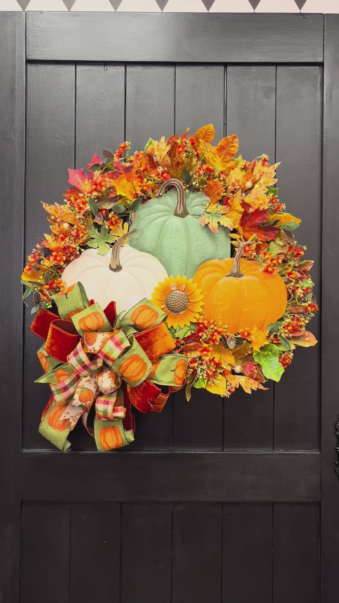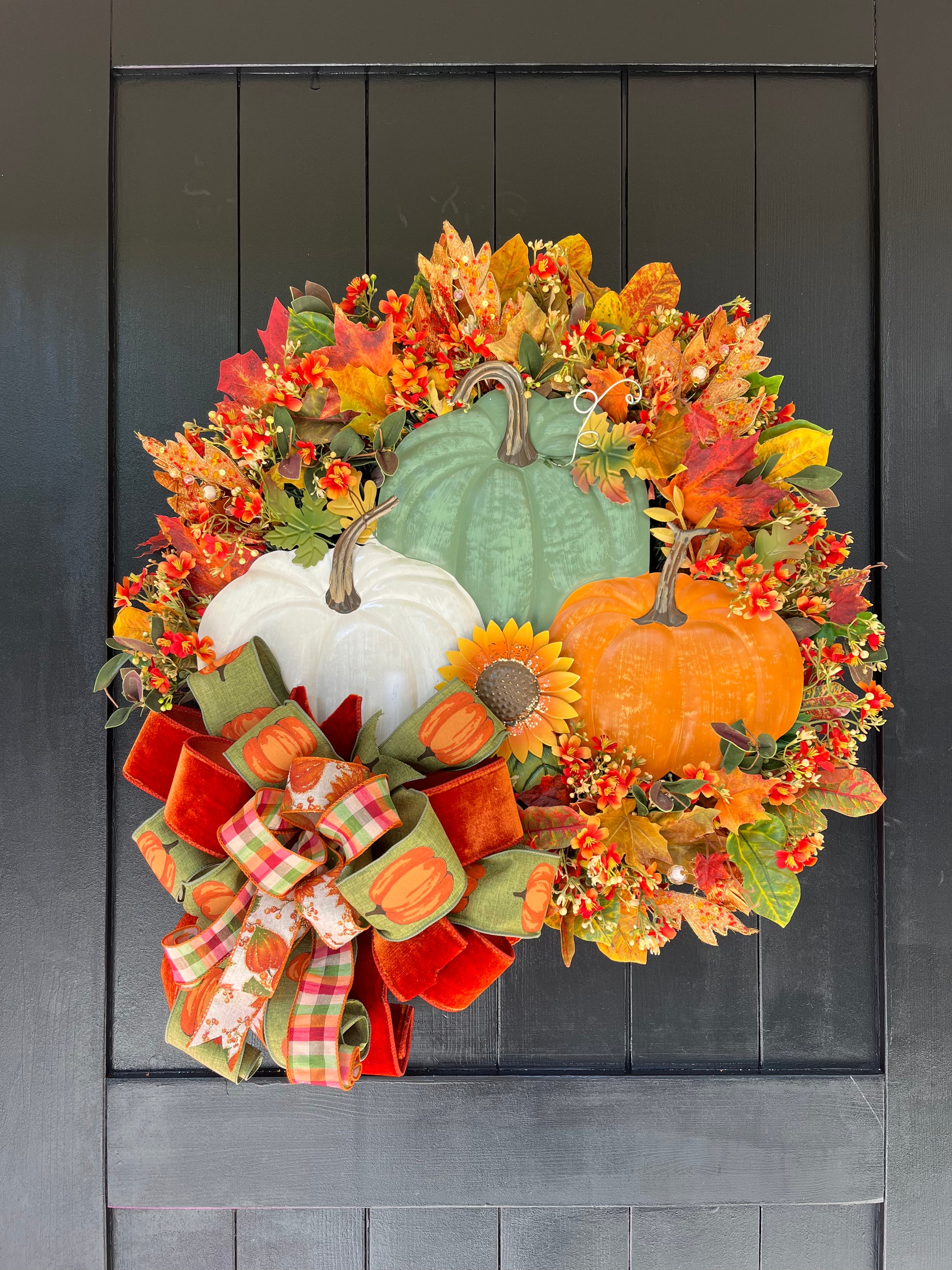Celebrate the cozy charm of autumn with this vibrant Pumpkin Trio Fall Wreath! Featuring a stunning arrangement of orange, sage green, and creamy white pumpkins surrounded by colorful fall leaves, berry sprigs, and a cheerful sunflower, this wreath brings the beauty of the harvest season right to your front door.