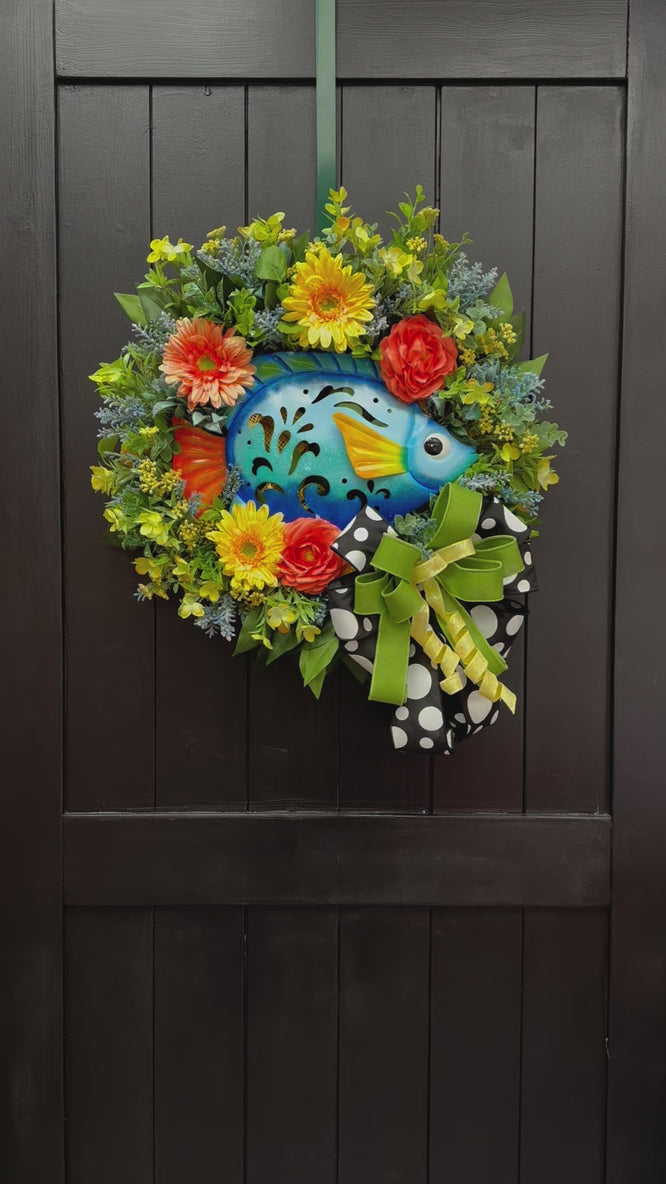 Make a splash this summer with our Tropical Fish Summer Wreath! Bursting with bright colors and playful personality, this wreath features a vibrant metal fish centerpiece surrounded by cheerful artificial blooms in sunny yellow, coral, and orange tones, complemented by lush greenery and soft blue accents.