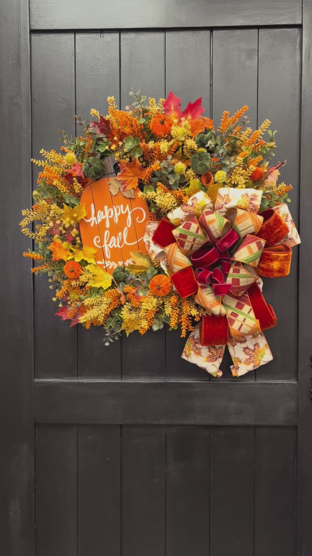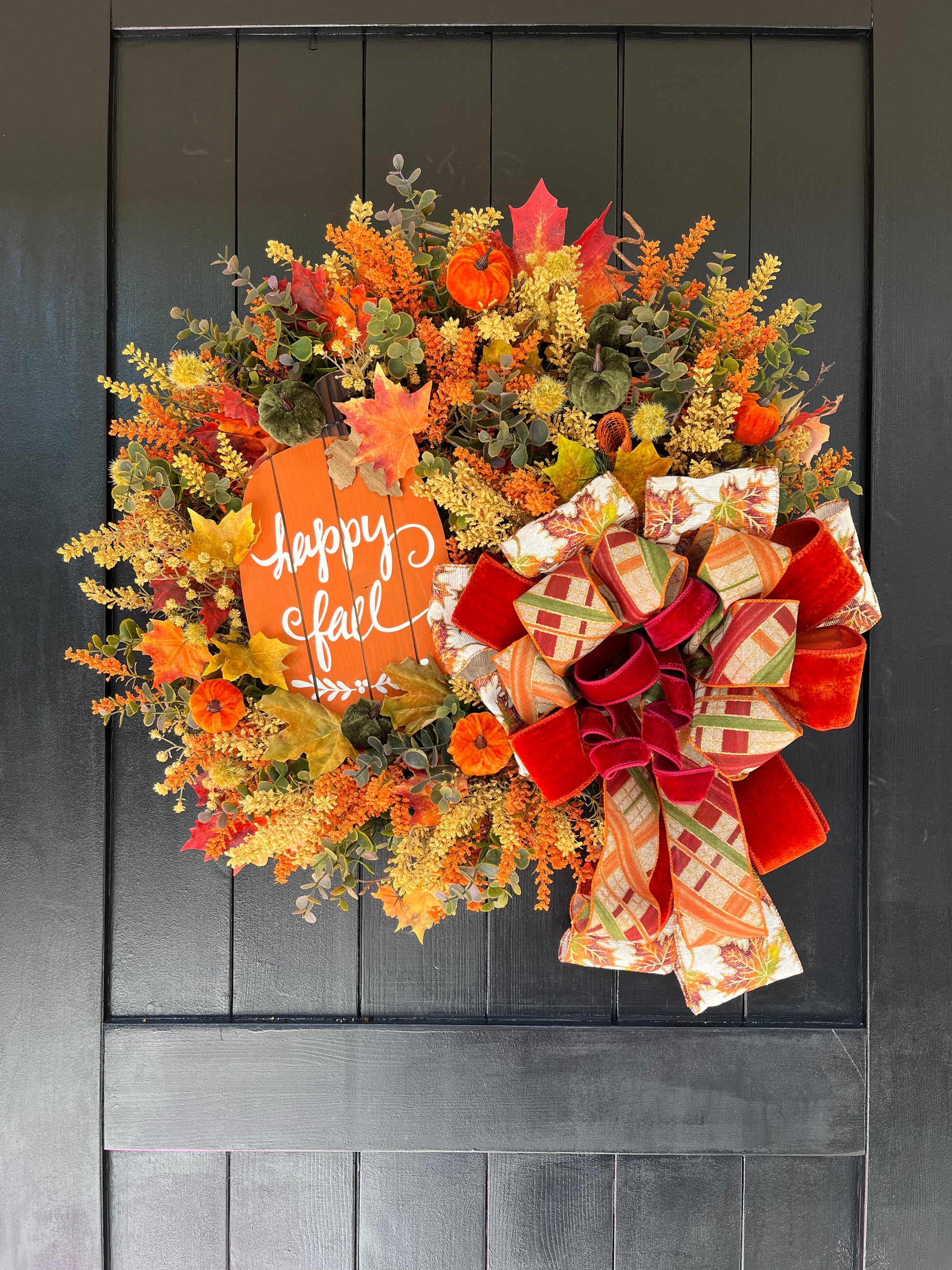 A layered bow in plaid, velvet, and leaf-print ribbons ties everything together, making this the perfect statement piece to celebrate the harvest season and add warmth to your front door.