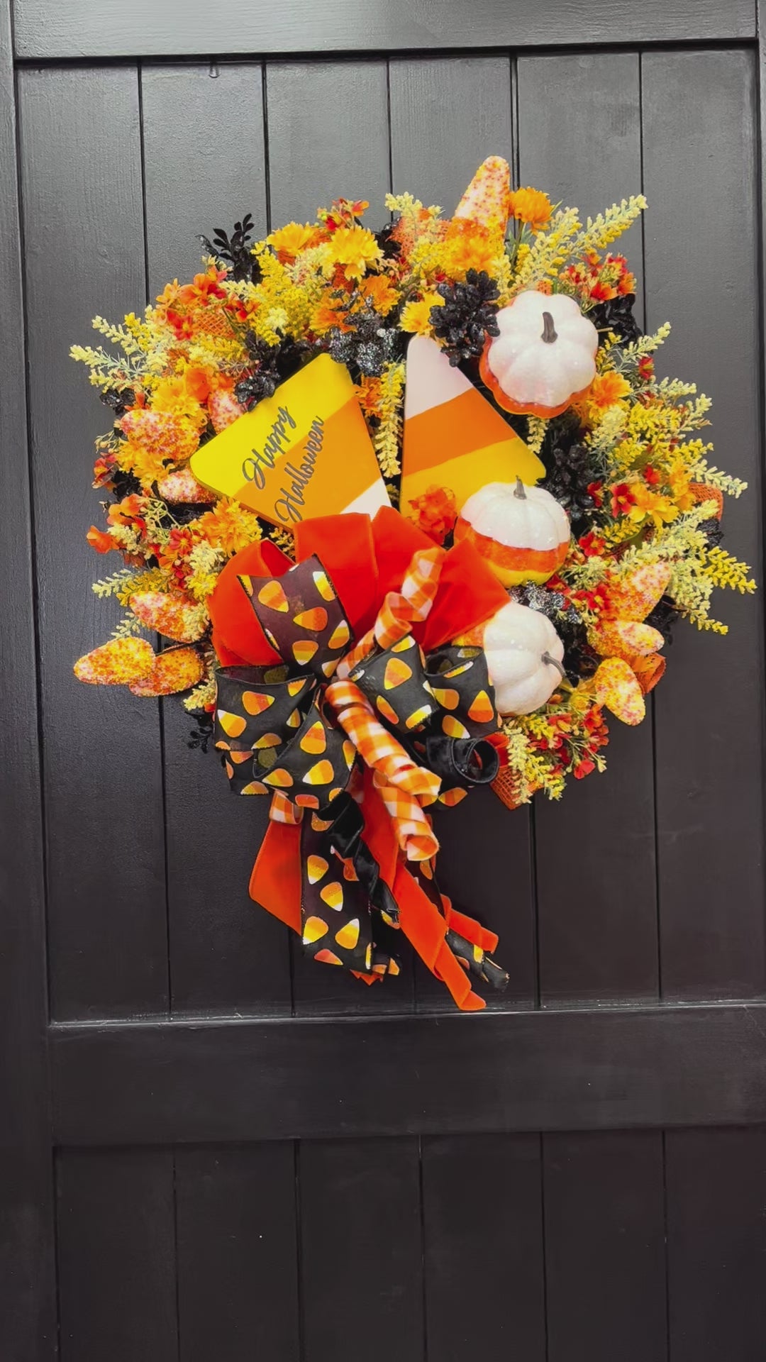 Treat your guests to a pop of Halloween fun with this vibrant Candy Corn Halloween Wreath! Overflowing with bright orange, yellow, and black florals, this cheerful wreath features oversized candy corn accents, glittered pumpkins, and a bold “Happy Halloween” sign for the perfect seasonal greeting.