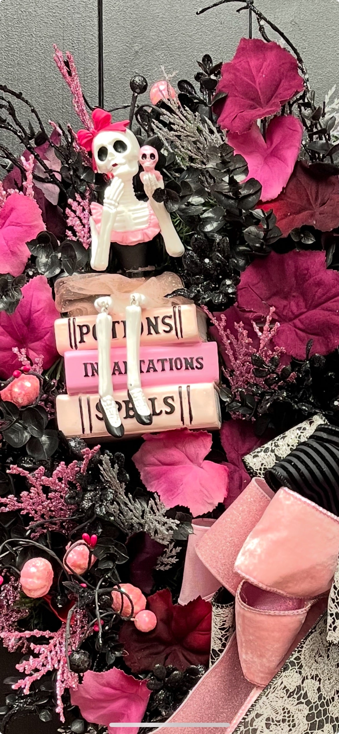 Turn your front door into a spooky-chic statement with this one-of-a-kind Halloween wreath! This bold design blends gothic glam with playful pink accents, making it the perfect décor for anyone who loves a little style with their scares.