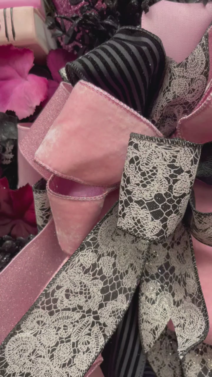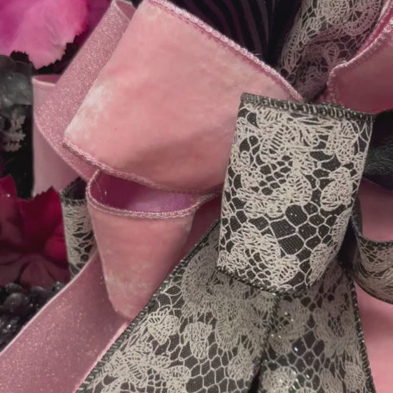 • Luxe oversized bow crafted from velvet pink, lace, and striped black ribbons