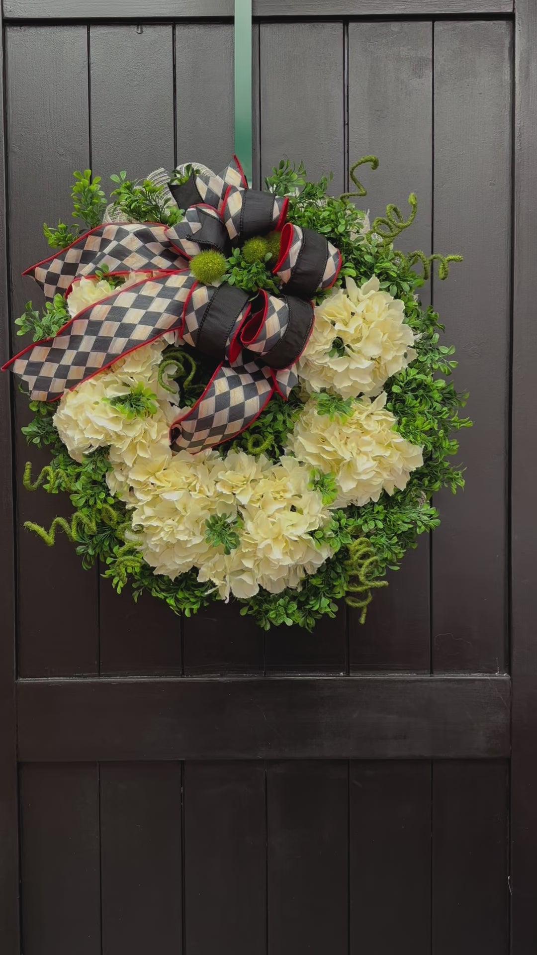 Add a touch of timeless elegance to your home with this handcrafted hydrangea wreath, adorned with luxurious MacKenzie-Childs harlequin ribbon. Creamy faux hydrangeas are nestled in a lush bed of boxwood greenery, offering a classic, sophisticated look that works beautifully all year long.