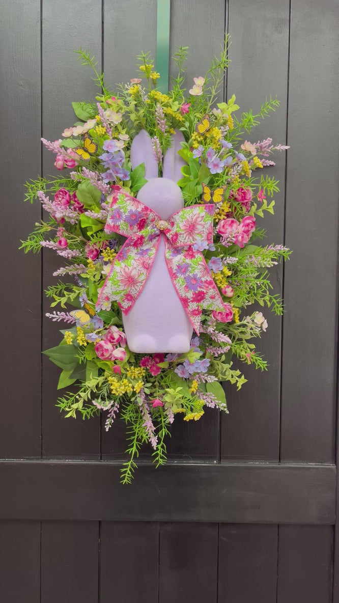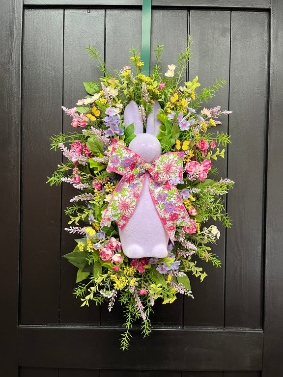 Celebrate the beauty of spring with this charming Easter wreath, designed to bring warmth and joy to your home! Featuring a delightful lavender bunny centerpiece, this wreath is surrounded by an array of vibrant faux flowers, including soft pink roses, lavender sprigs, yellow wildflowers, and lush greenery. A floral-patterned bow adds the perfect finishing touch, making this a standout piece for Easter and beyond.