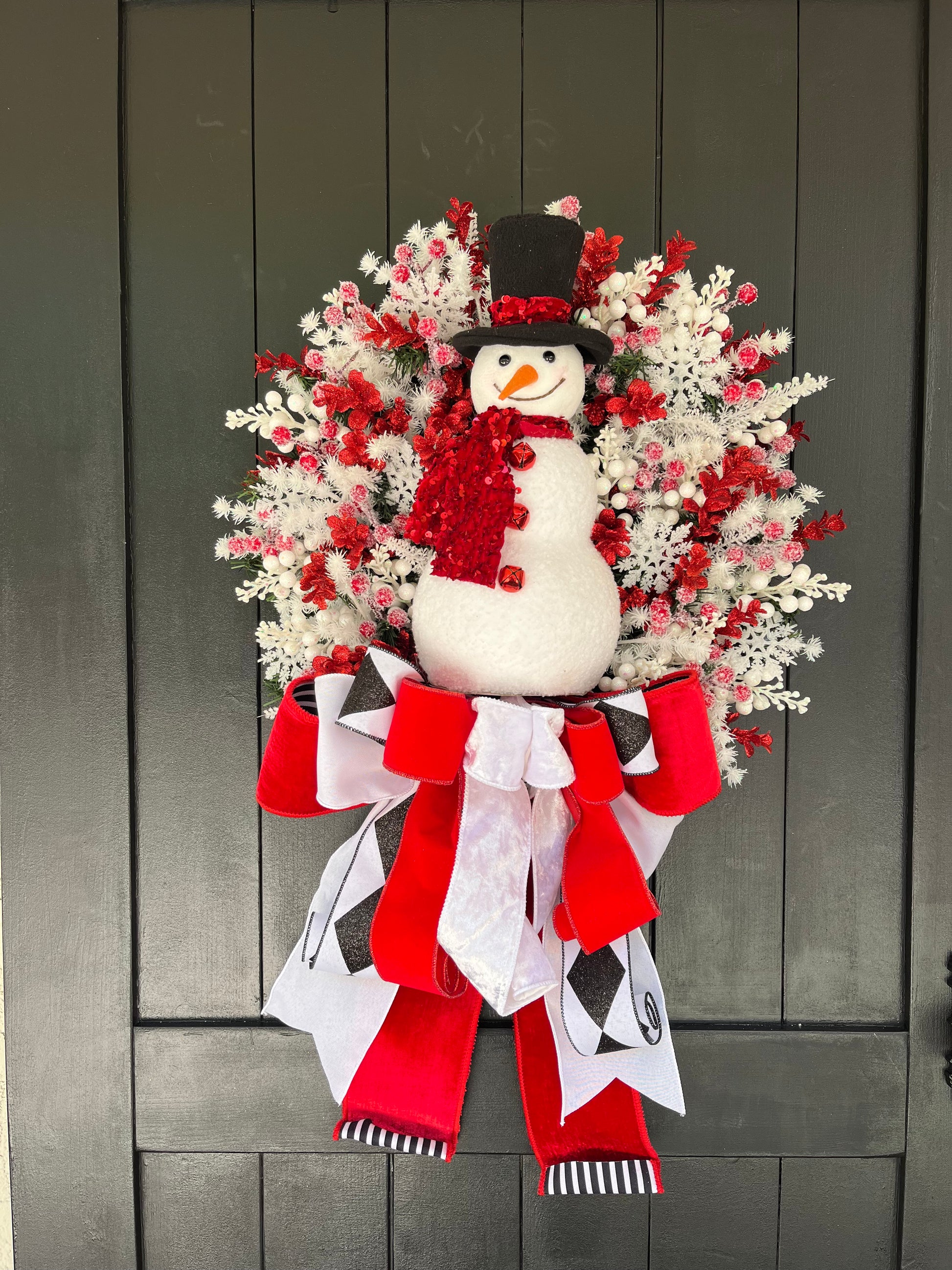 Welcome the season with this cheerful handcrafted snowman wreath, perfect for bringing winter joy to your home. A smiling snowman in a classic black top hat and red scarf stands at the center, surrounded by frosted greenery, snowy white berries, and pops of festive red.