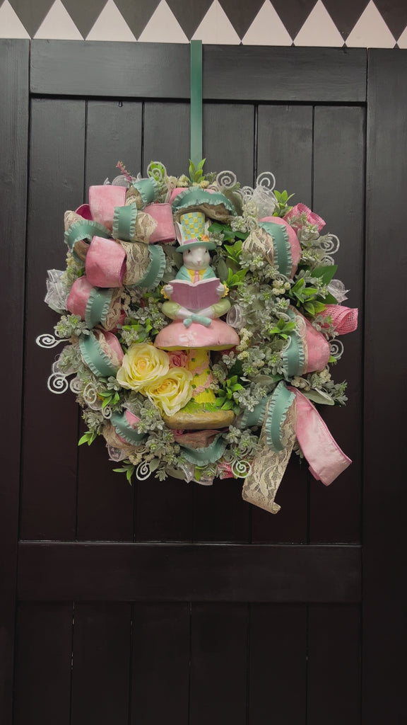 This wreath features an adorable bunny wearing a top hat, reading a book while sitting on a mushroom. It is filled with stunning blue and pink ribbon, floral picks and greenerie. It is finished with two large yellow roses. This wreath is the perfect addition to your door for spring time!