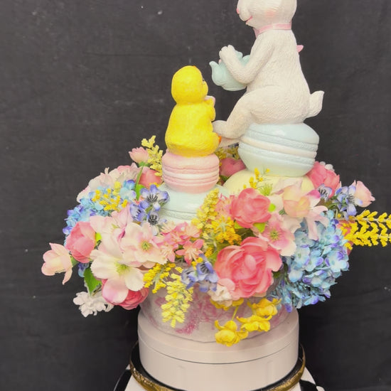 Bring charm and sweetness to your Easter or spring décor with this enchanting bunny tea party centerpiece. Featuring an adorable white bunny holding a pastel teapot and a cheerful yellow chick with a tiny teacup, this piece feels like it came straight out of a storybook garden.