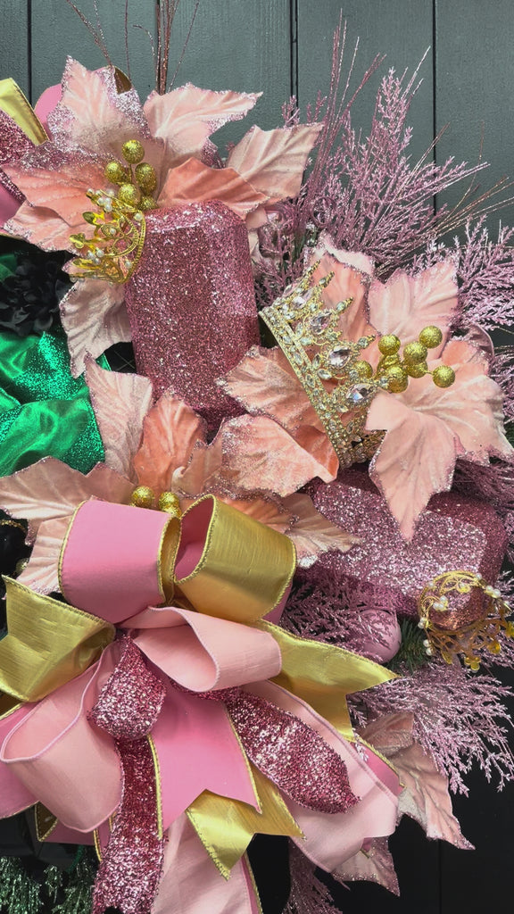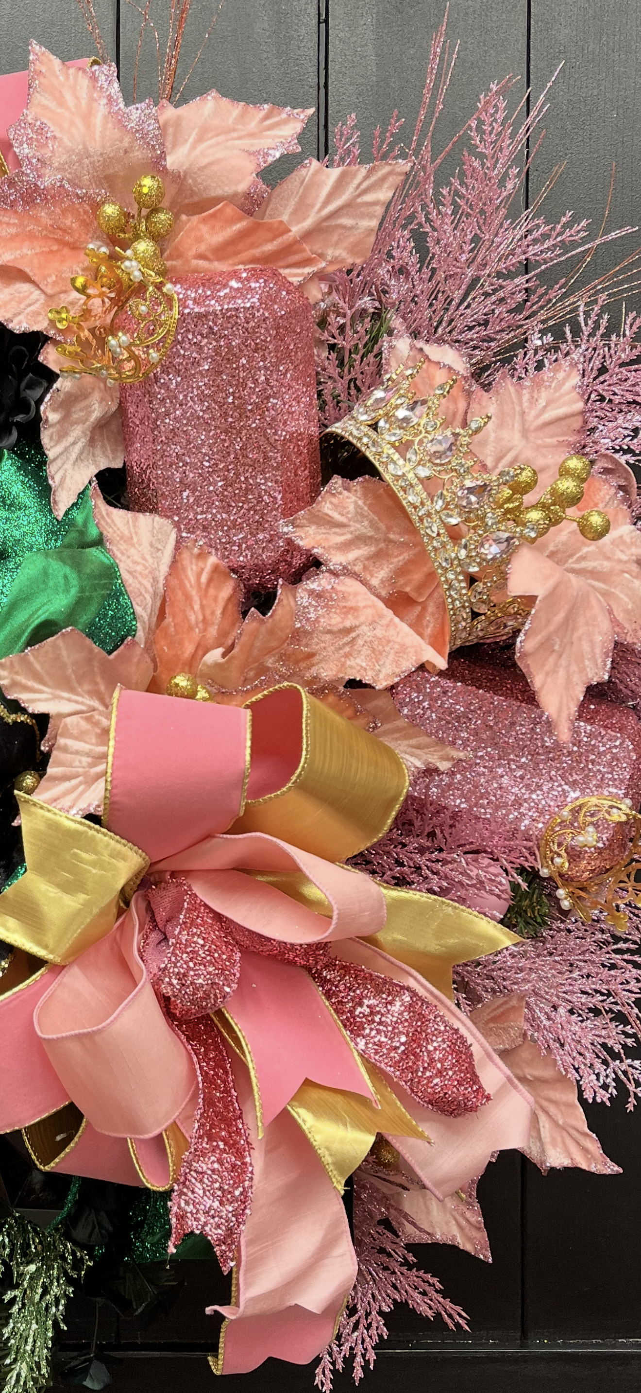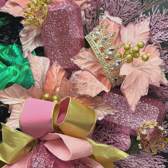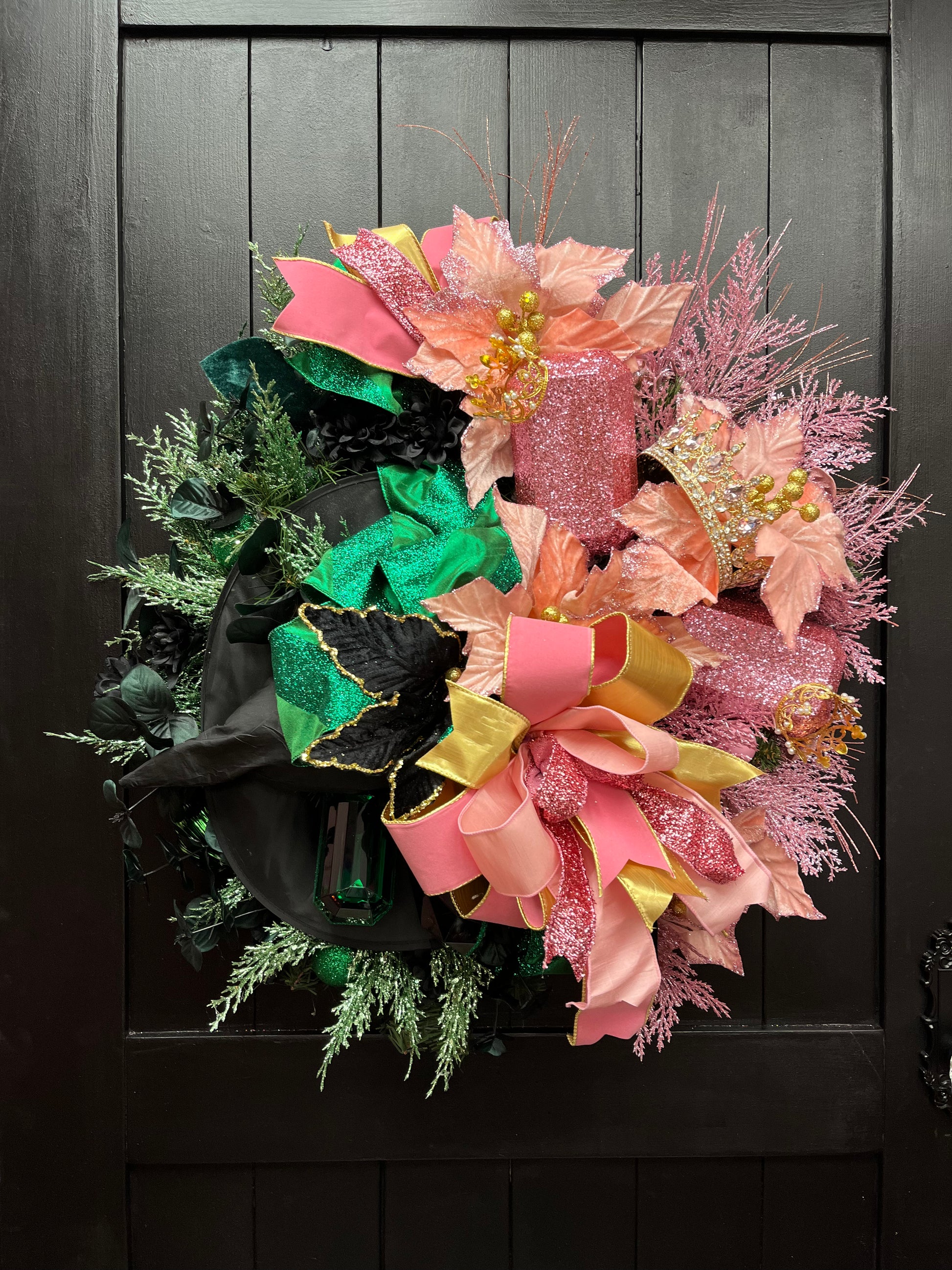 Step into Oz-level drama with this showstopping Glam Wicked Witch wreath — where spellbinding magic meets pink-and-gold glamour! This handcrafted design reimagines the classic wicked witch in a high-fashion palette of sparkling blush, emerald green, and glimmering gold.