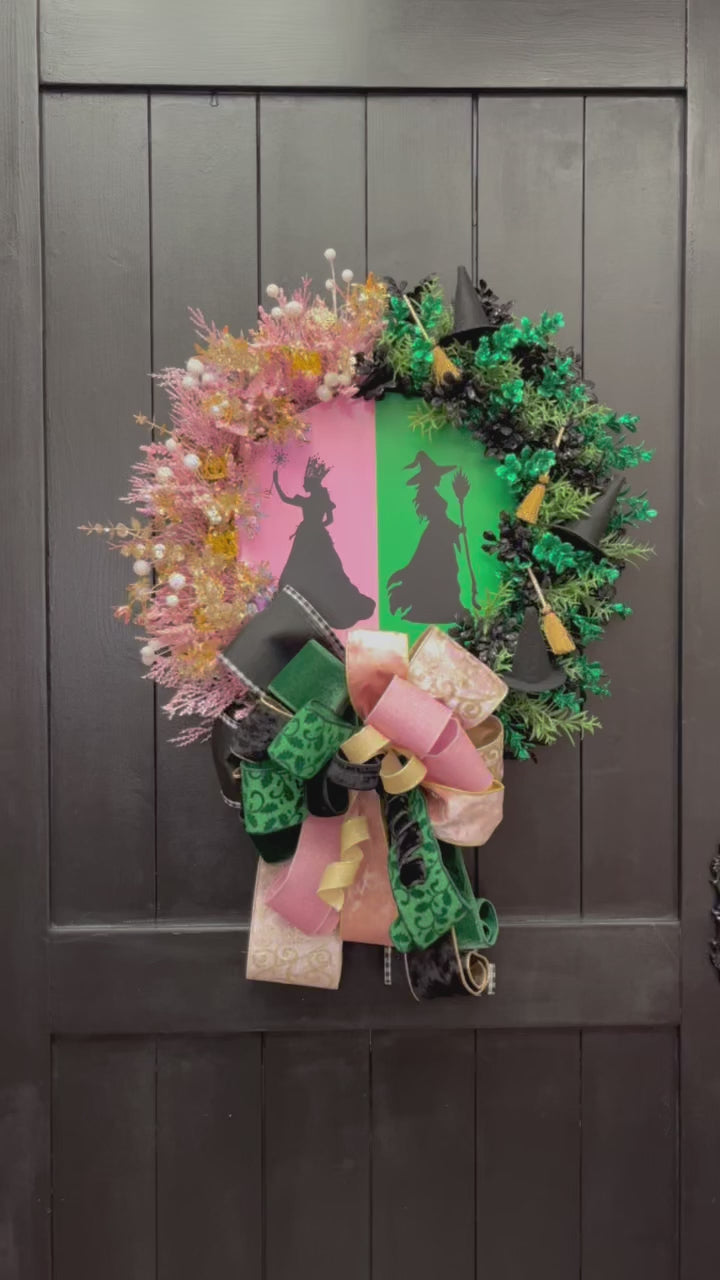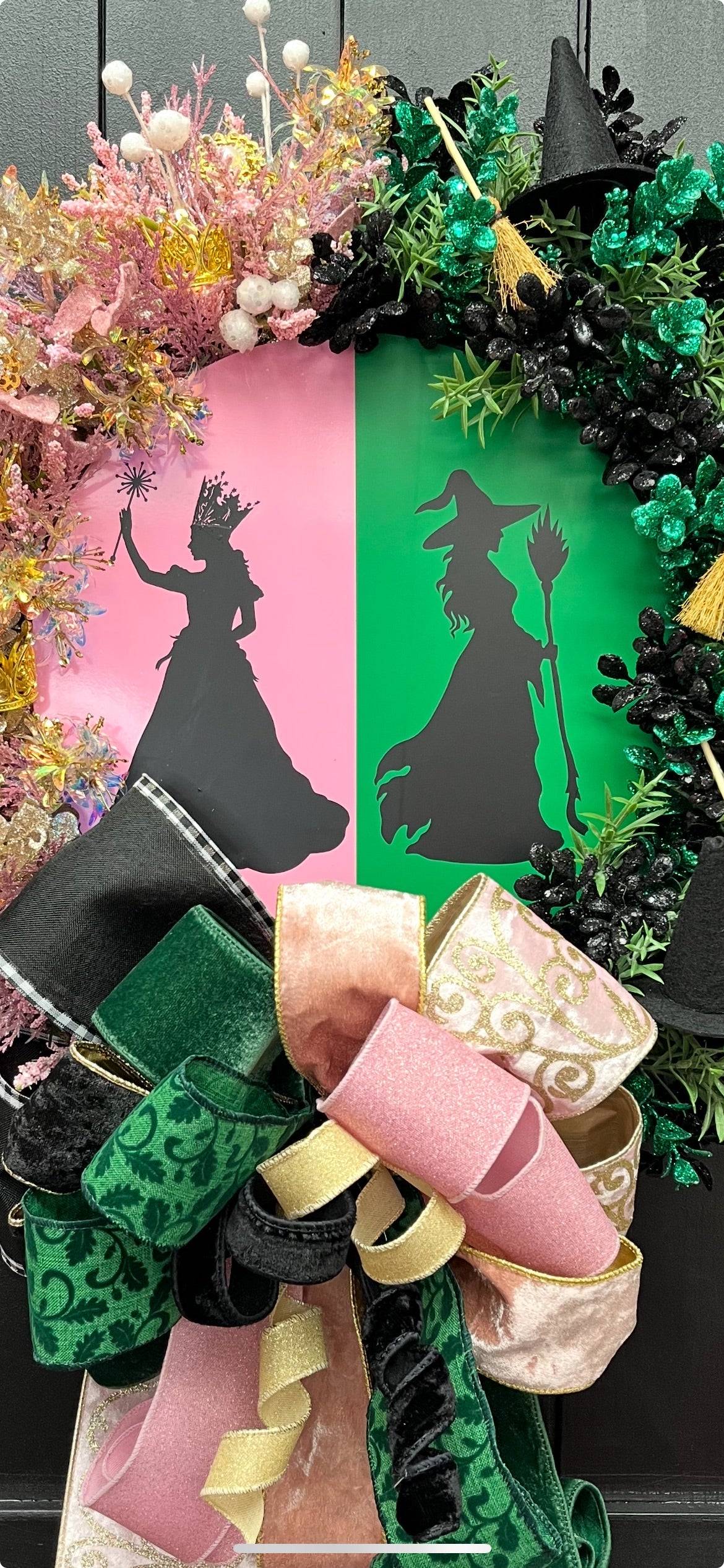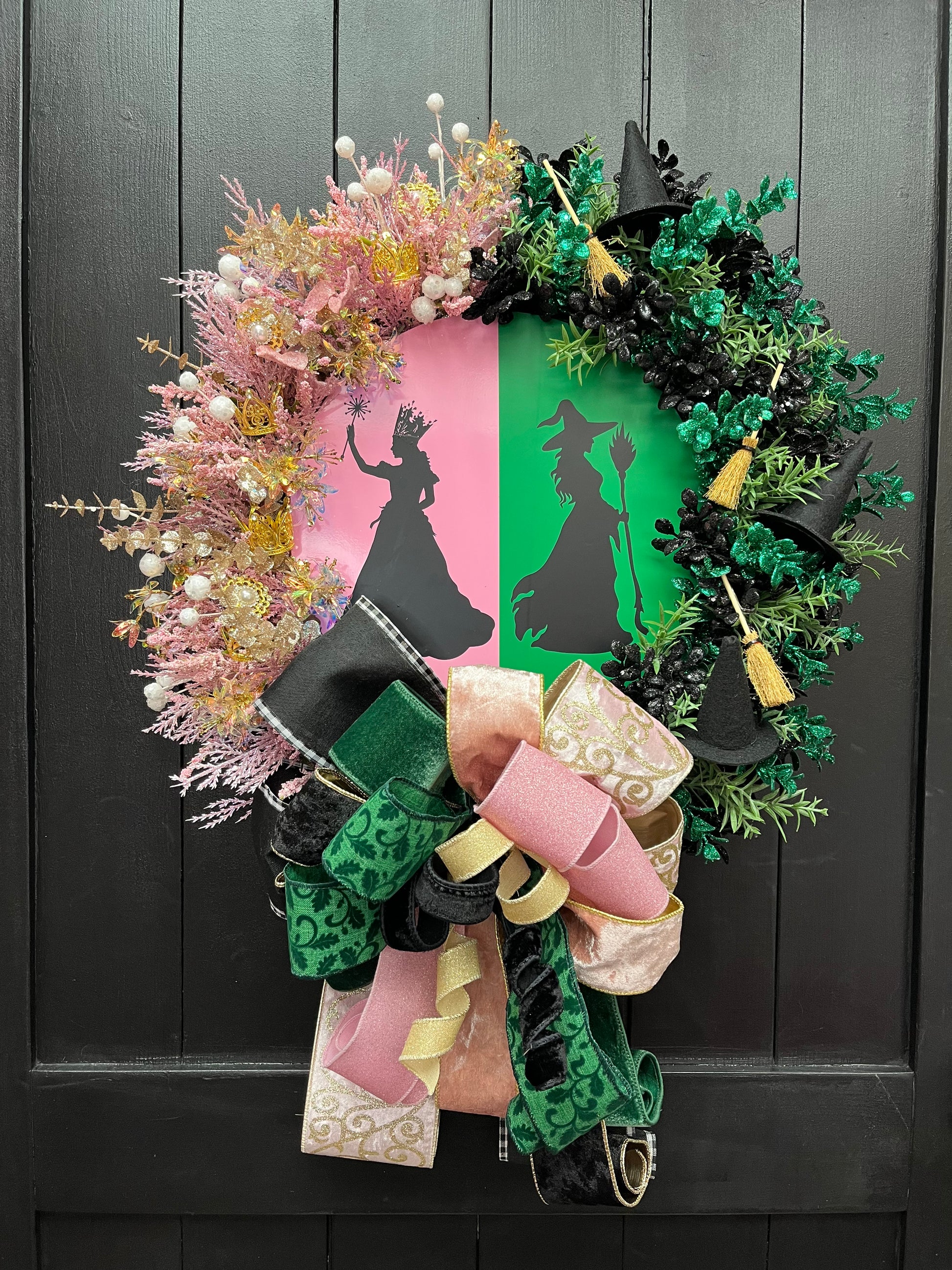 Step into the world of Oz with this enchanting Wicked-themed wreath! Perfect for fans of the beloved Broadway musical, this one-of-a-kind design brings both Glinda the Good Witch and Elphaba the Wicked Witch to life in stunning contrast.