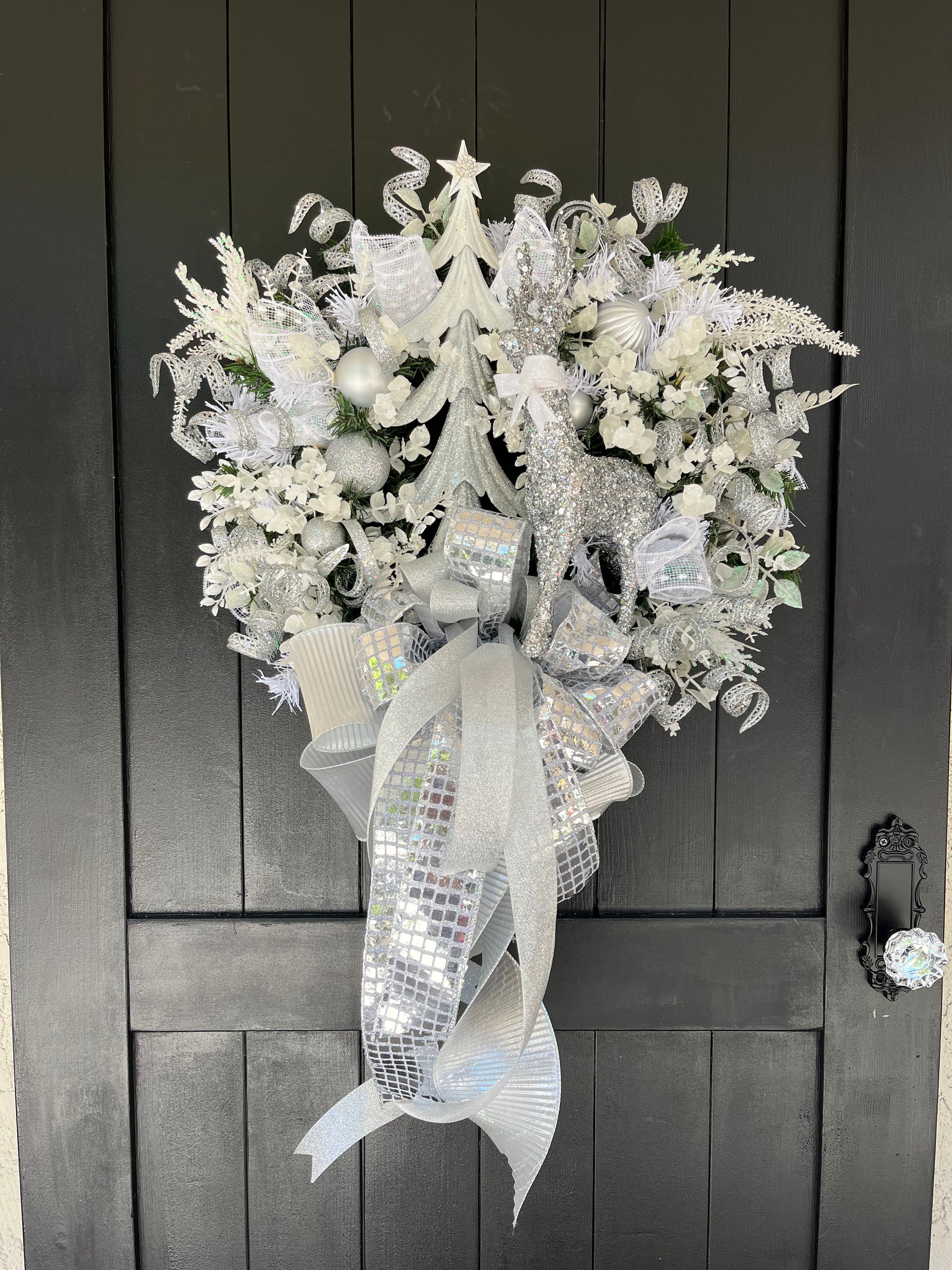 At the center, a glittering Christmas tree and dazzling reindeer bring whimsical charm, while the oversized bow—crafted from iridescent, holographic, and glittered silver ribbons—cascades gracefully for a dramatic finish. Perfect for making a grand statement on your front door, above your mantel, or as part of an indoor holiday display.